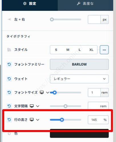 行間の設定(行の高さ)は隠しコマンドみたいになってるんです。タイポグラフィの横にある『…』を押すと、ようやく現れます。日本語LPを作るなら、ここをデフォルトの130%から、150%以上に広げるのがプロっぽく見せるコツですよ。