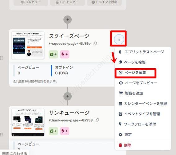 そこにある各ページの「︙(編集)」ボタンを押し、「ページを編集」を選択します。ここで初めて先ほどお話しした「エディタ画面」が開く仕組みです。