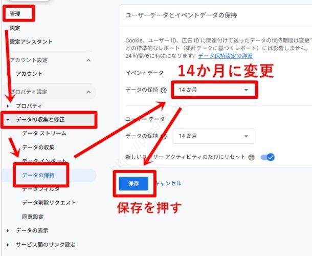 「管理」→「データの収集と修正」→「データ保持」から、2ヶ月を14ヶ月に変更してください。これをしておかないと、過去のデータと比較ができなくなります。
