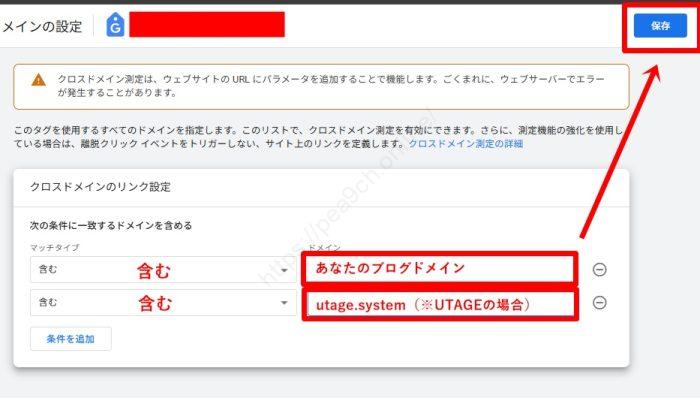 ドメインには「(あなたのブログドメイン)」、さらにもう一行追加して、「utage.system」(※UTAGEの場合)となるようにして「保存」をクリックします。
