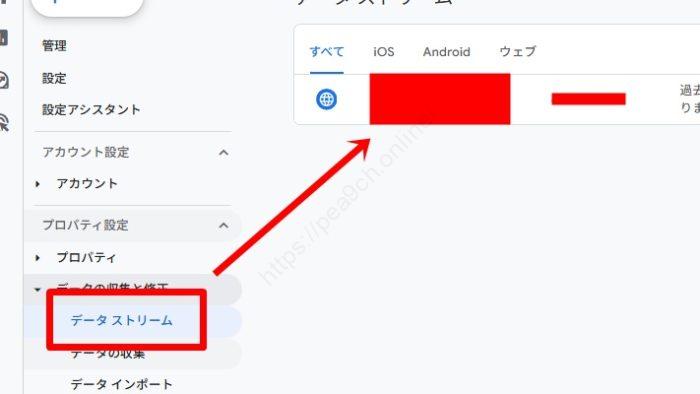 画面左側のメニュー 「データストリーム」→ご自身のサイト名(またはURL)が表示されるので、その 「行」をどこでもいいのでクリック します。