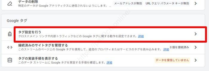 先ほどと同様に「データストリーム」 をクリックして表示される自分のサイトをクリック→「タグ設定を行う」と進みます。