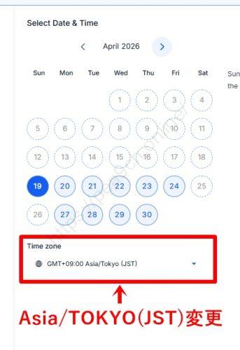 カレンダーが表示されますので、タイムゾーンを「GMT+09:00 Asia/TOKYO(JST) に変更します。