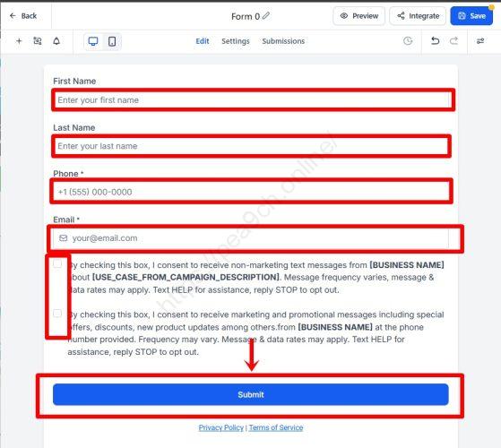 Submit(送信)ボタンの前の英文は、一言で言うと「SMS(ショートメッセージ)送信に関する同意文」です。