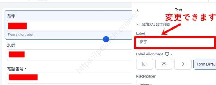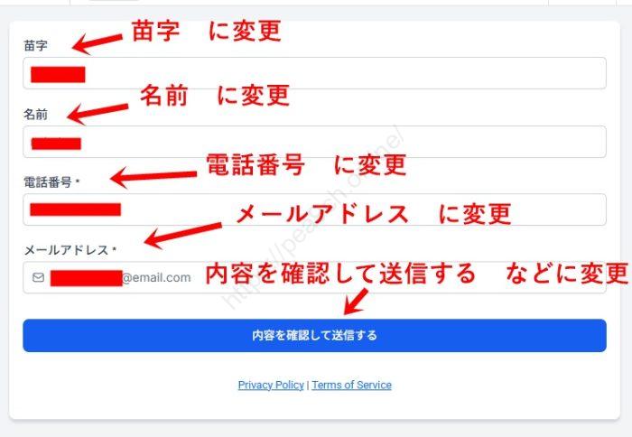 項目のラベル(Placeholder)を「お名前」「メールアドレス」など日本語に書き換えます。