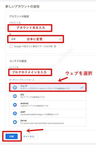 まずはGoogleタグマネージャー(GTM)の公式サイトを開き、アカウント(社名や自分の名前)とコンテナ(サイトのドメイン名)を作成します。プラットフォームは「ウェブ」を選択してください。