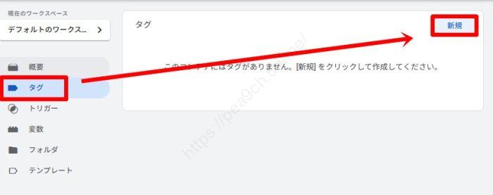 GTMの管理画面で「タグ」→「新規」を選択。