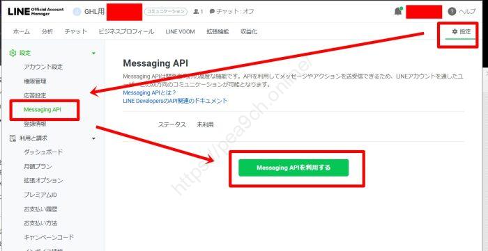 管理画面の右上にある「設定」をクリックし、左メニューから「Messaging API」を選択。中央の緑色のボタンをクリックしてください。